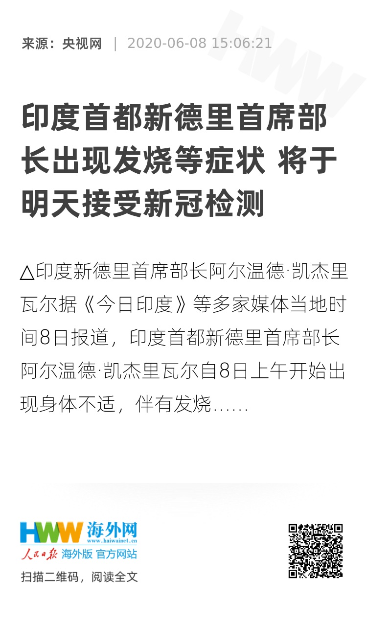 据《今日印度》等多家媒体当地时间8日报道,印度首都新德里首席部长阿尔温德·凯杰里瓦尔自8日上午开始出现身体不适,伴有发烧和咳嗽等症状。据悉,目前凯杰里瓦尔本人正在自我隔离中,将于明天接受新冠肺毒样本检测。(总台记者 廖继勇)