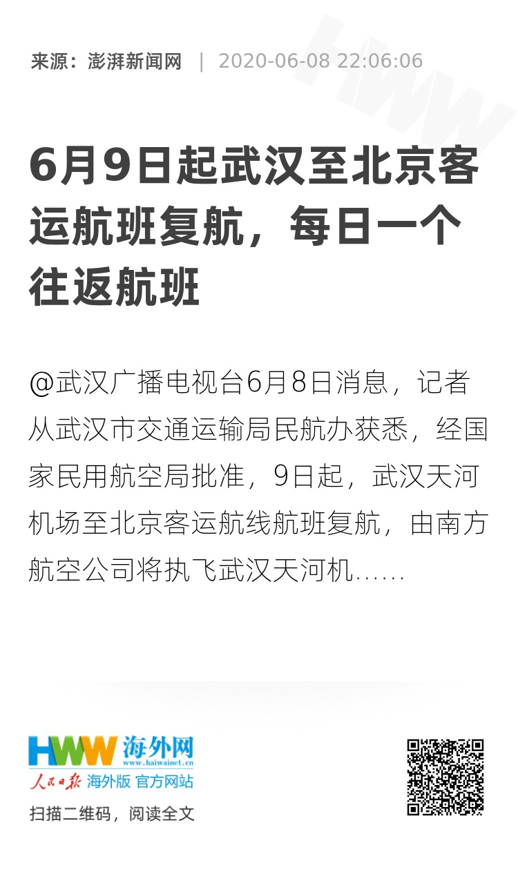 31809151,.6月9日起武汉至北京客运航班复航,每日一个往返航班,.2020-06-08 22:16:06,.204417,.袁如霞