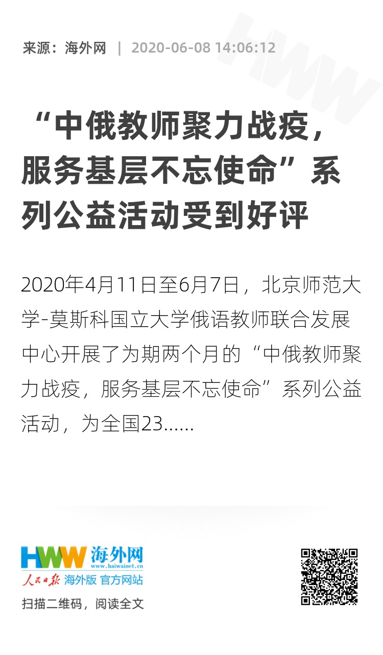 2020年4月11日至6月7日,北京师范大学-莫斯科国立大学俄语教师联合发展中心开展了为期两个月的“中俄教师聚力战疫,服务基层不忘使命”系列公益活动,为全国23个省、市、自治区的500余名中学俄语教师提供了六期在线教学技能提升公益培训,完成了对中国中学俄语教师的全覆盖培训。本次系列活动由北京师范大学外国语言文学学院党委书记、北京师范大学-莫斯科国立大学俄语教师联合发展中心中方主任刘娟发起并策划,旨在推动中国中学俄语教学改革,并以实际行动开展教育扶贫。活动得到了北师大外文学院俄文系和莫大俄语与文化学院教师们的积极响应。