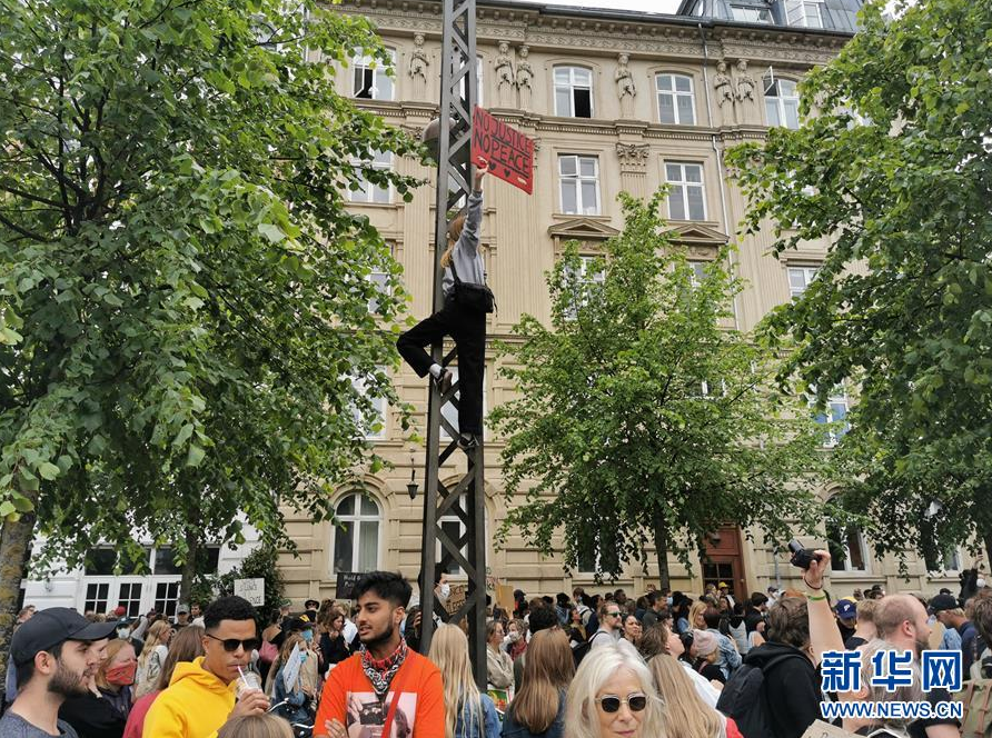 6月7日,抗议者在位于丹麦哥本哈根的美国大使馆前高举写有“没有正义就没有和平”的标语进行抗议。 当日,民众在丹麦哥本哈根游行抗议在美国发生的针对非洲裔群体的种族歧视行为。5月25日,美国明尼阿波利斯市警察在拘捕非洲裔男子弗洛伊德时用膝盖持续压迫他的颈部,弗洛伊德随后死亡,4名涉案警察分别以谋杀罪和过失杀人罪等被起诉。 新华社发(大卫·威廉姆斯摄)