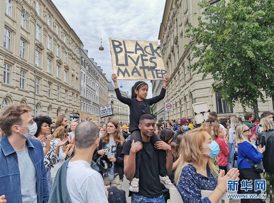 6月7日,一名女孩在位于丹麦哥本哈根的美国大使馆前高举写有“黑人的命也是命”的标语进行抗议。 当日,民众在丹麦哥本哈根游行抗议在美国发生的针对非洲裔群体的种族歧视行为。5月25日,美国明尼阿波利斯市警察在拘捕非洲裔男子弗洛伊德时用膝盖持续压迫他的颈部,弗洛伊德随后死亡,4名涉案警察分别以谋杀罪和过失杀人罪等被起诉。 新华社发(大卫·威廉姆斯摄)