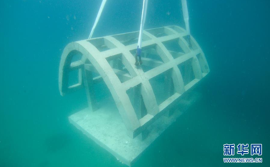 在海南三亚蜈支洲岛海域,旅游区工作人员将船型屋鱼礁吊装入海(2016年1月21日摄)。 新华社发
