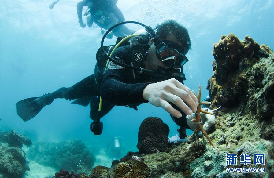 在海南三亚蜈支洲岛海域,中科院南海海洋研究所副研究员张浴阳团队工作人员在海底的移植钉上固定珊瑚(4月28日摄)。 新华社记者 杨冠宇 摄