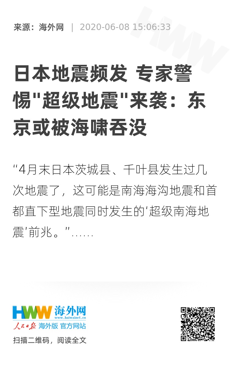 海外网6月8日电 “4月末日本茨城县、千叶县发生过几次地震了,这可能是南海海沟地震和首都直下型地震同时发生的‘超级南海地震’前兆。”拉响警钟的是专门研究灾害史和灾害危机管理的日本立命馆大学特任教授高桥学,他认为,这两种地震整个日本带来的打击是致命性的,一旦发生,至少造成47万余人的死亡。