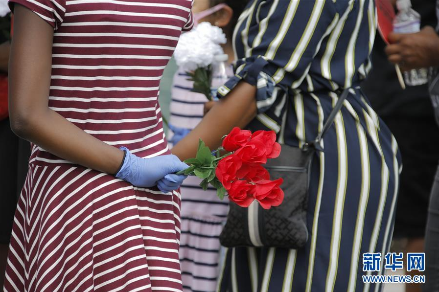 6月8日,在美国得克萨斯州休斯敦市,人们手拿花束等待瞻仰弗洛伊德遗体。 当日,因白人警察暴力执法而死亡的非洲裔美国人乔治·弗洛伊德遗体公众瞻仰活动在美国南部得克萨斯州休斯敦市一座教堂内举行。 新华社发(劳承跃摄)