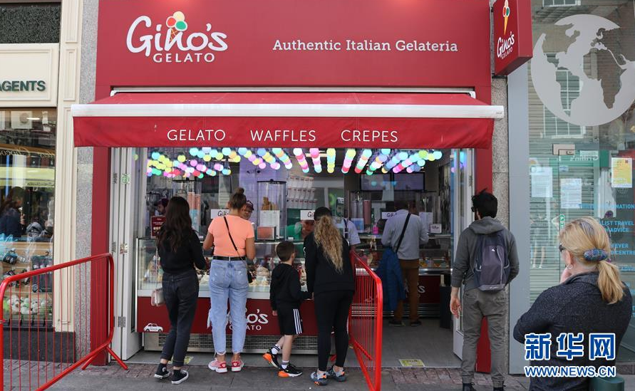 6月8日,人们光顾爱尔兰都柏林一家恢复营业的冰淇淋店。 当日,爱尔兰如期进入社会经济重启计划第二阶段,更多的商业和公共设施恢复营业和重新对外开放,人们也有了更多的行动自由。 新华社发