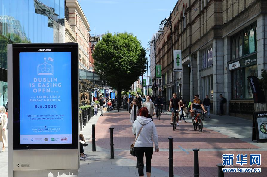6月8日,人们走过爱尔兰都柏林街头一处打着庆祝社会经济重启广告语的电子屏。 当日,爱尔兰如期进入社会经济重启计划第二阶段,更多的商业和公共设施恢复营业和重新对外开放,人们也有了更多的行动自由。 新华社发