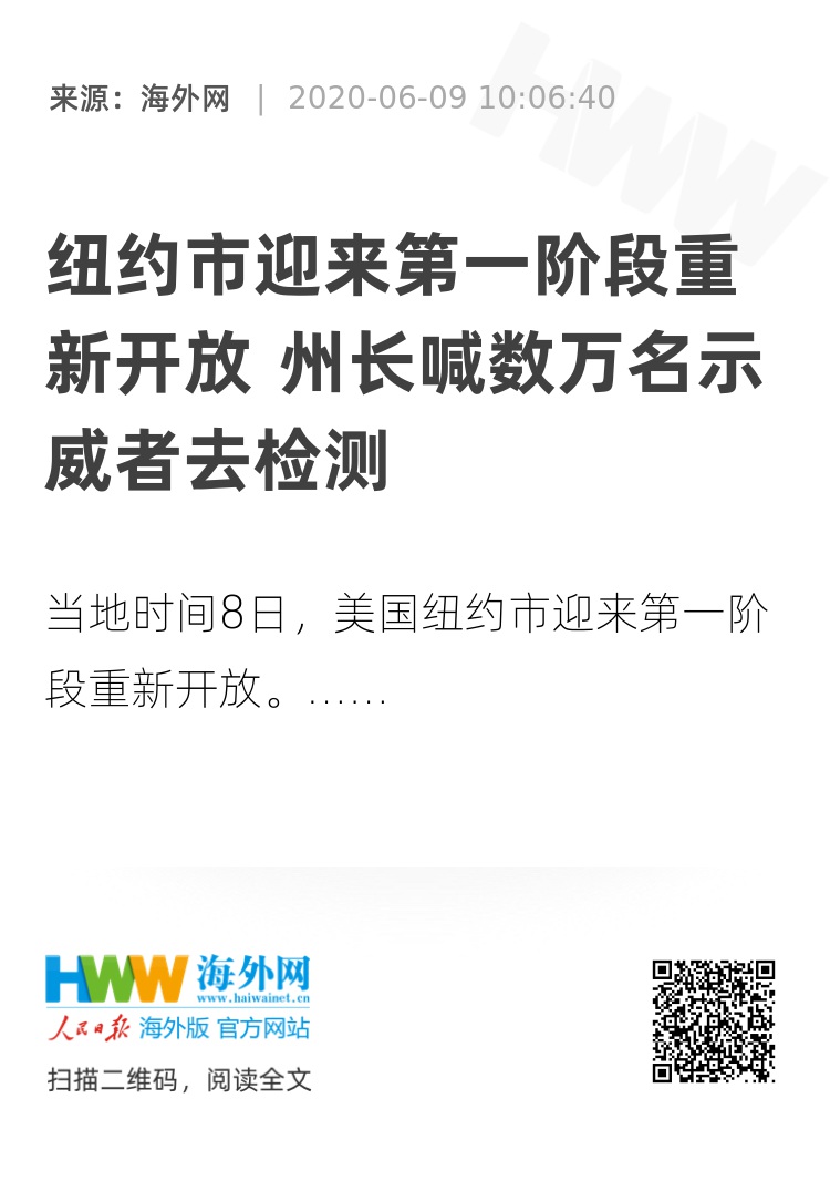 海外网6月9日电 当地时间8日,美国纽约市迎来第一阶段重新开放,纽约州长科莫当天新闻发布会上,要求示威者进行新冠病毒检测。