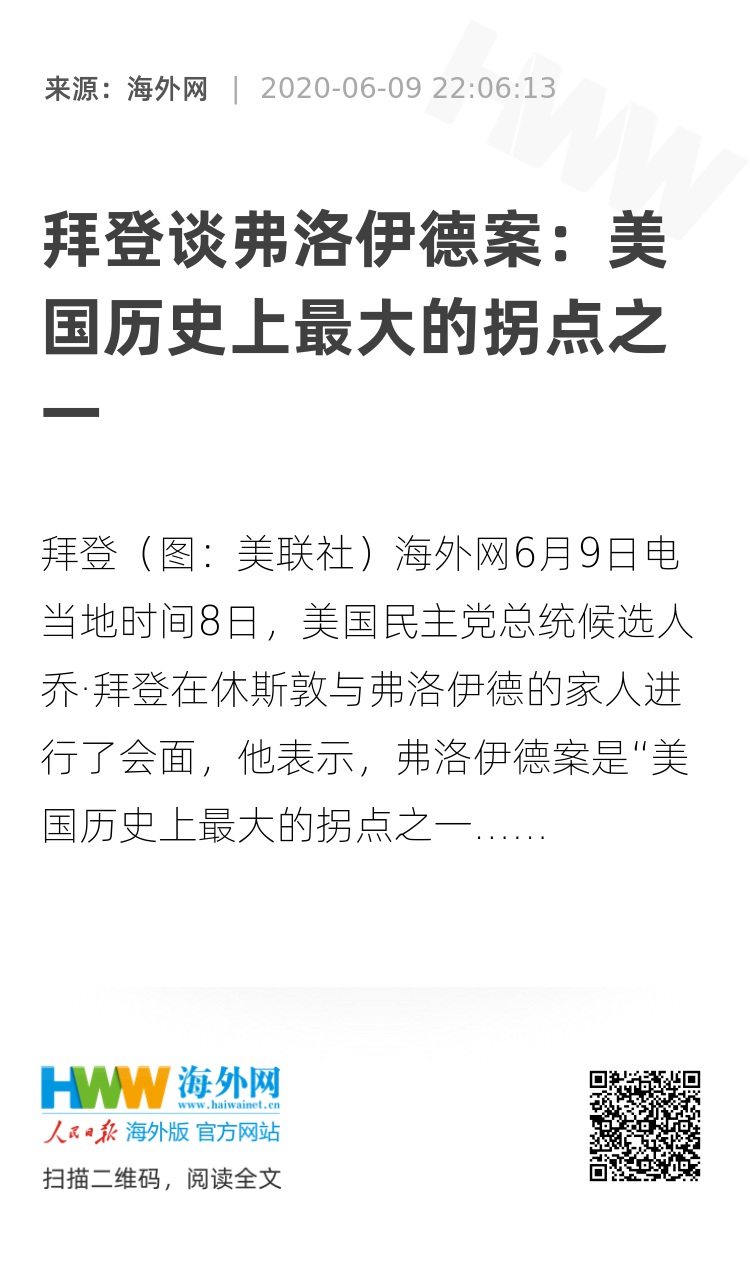 拜登还表示,弗洛伊德的死是“美国历史上最大的拐点之一”,“从公民自由、公民权利以及公正对待有尊严的人的角度而言,的确如此”。