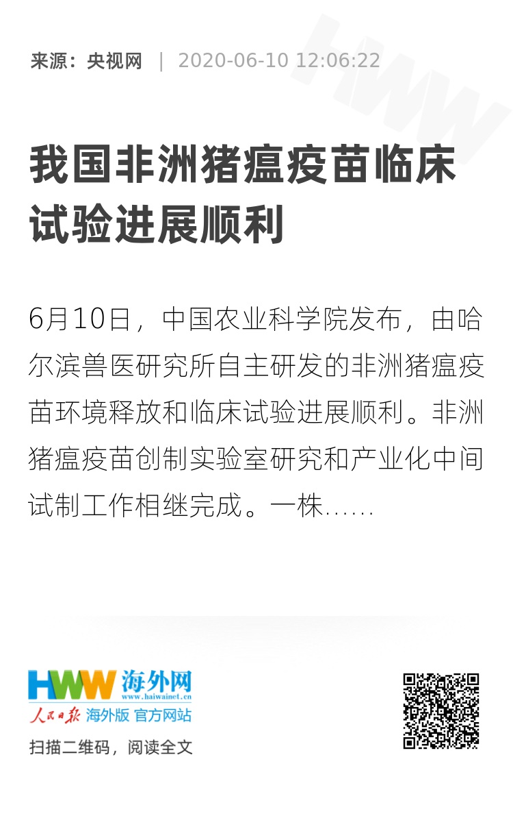 6月10日,中国农业科学院发布,由哈尔滨兽医研究所自主研发的非洲猪瘟疫苗环境释放和临床试验进展顺利。