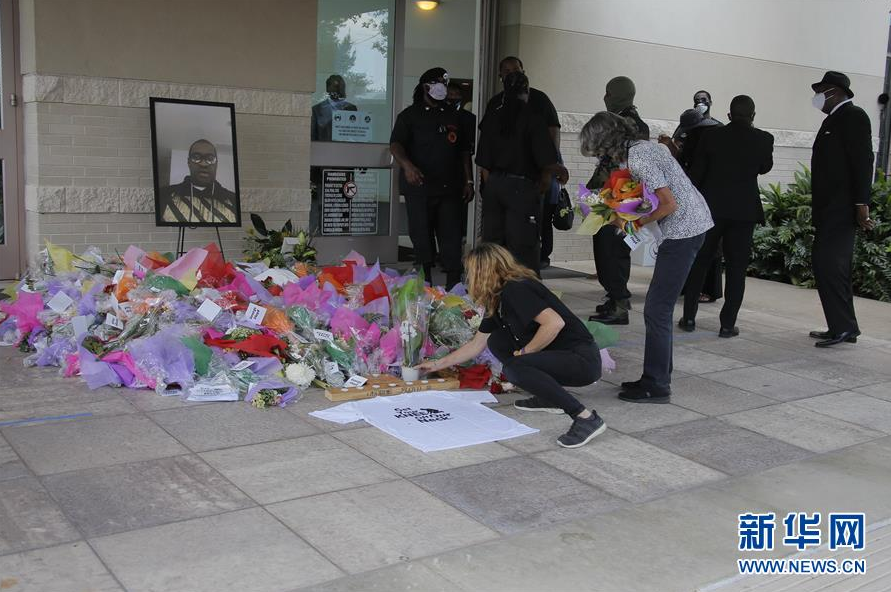 6月9日,在美国得克萨斯州休斯敦,人们在举行弗洛伊德葬礼的教堂外献花。 因警察暴力执法而死亡的非裔美国人弗洛伊德的葬礼9日在其“家乡”——休斯敦市的一座教堂举行。葬礼结束后,弗洛伊德的遗体被运往休斯敦一处墓地安葬。 新华社发(劳承跃摄)