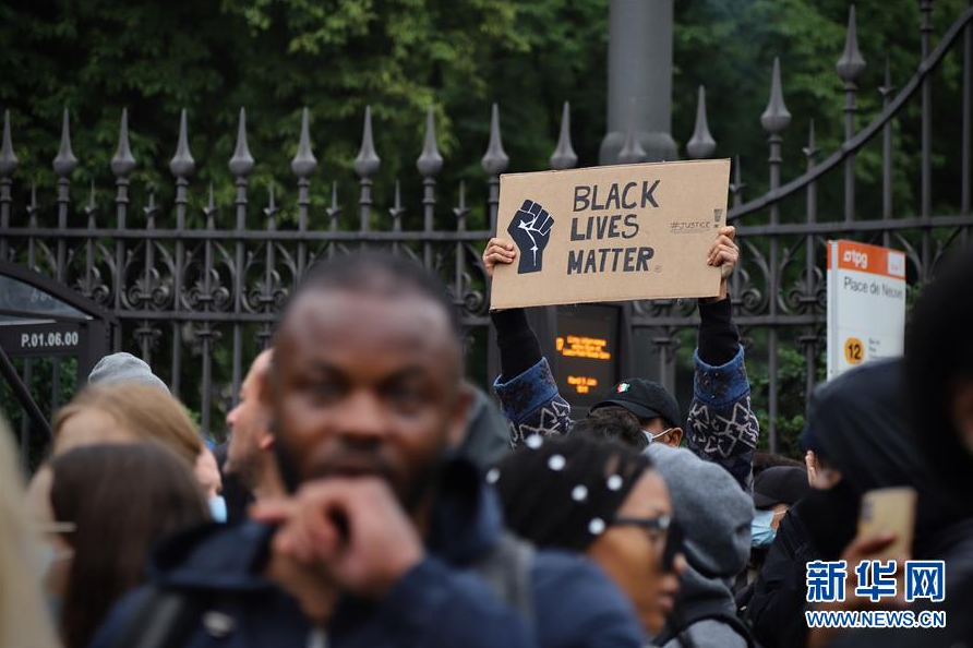 6月9日,抗议者手举“黑人的命也是命”标语牌在瑞士日内瓦街头参加示威活动。 众多抗议者9日聚集在瑞士日内瓦老城附近的广场,抗议在美国发生的针对非洲裔群体的种族歧视行为。 新华社发(李叶摄)