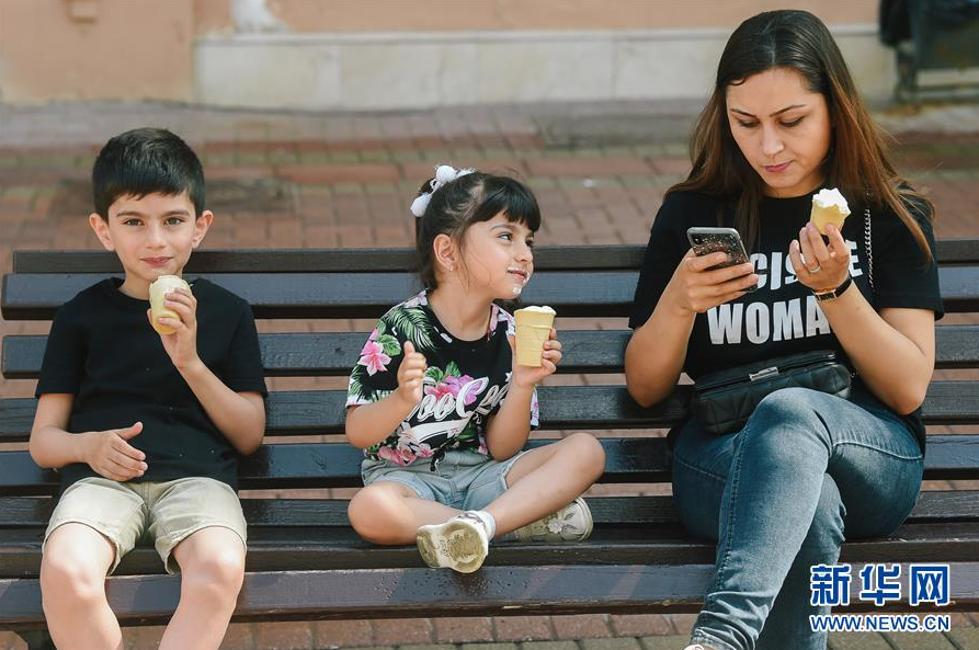 6月9日,人们在俄罗斯首都莫斯科街头吃冰淇淋。新华社发(叶甫盖尼·西尼岑摄)