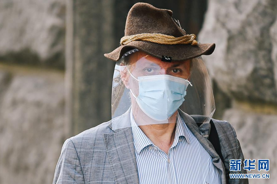 6月9日,在俄罗斯首都莫斯科,一名男子佩戴口罩和防护面罩出行。新华社发(叶甫盖尼·西尼岑摄)