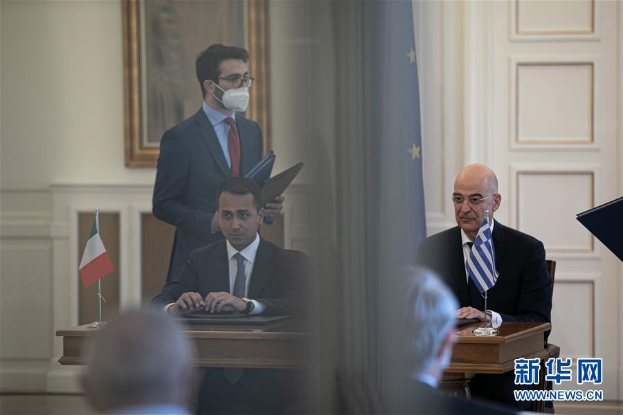 意大利外交部长路易吉·迪马约9日访问希腊雅典期间,希、意两国签署一份关于海上边界的协议。 新华社发(莱夫特里斯·帕察里斯摄)