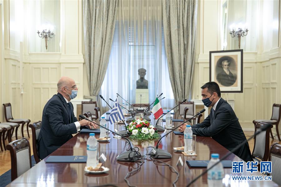 意大利外交部长路易吉·迪马约9日访问希腊雅典期间,希、意两国签署一份关于海上边界的协议。 新华社发(莱夫特里斯·帕察里斯摄)