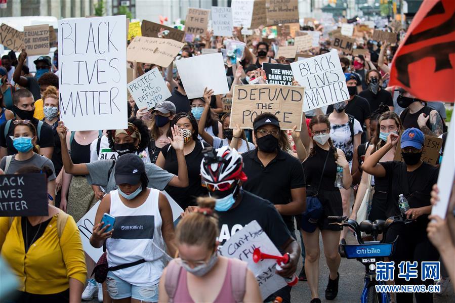 6月9日,人们在美国纽约街头参加抗议活动。 美国明尼阿波利斯市警察暴力执法致非裔男子乔治·弗洛伊德死亡,由此引发的抗议活动当日在美国纽约继续进行。 新华社发(郭克摄)
