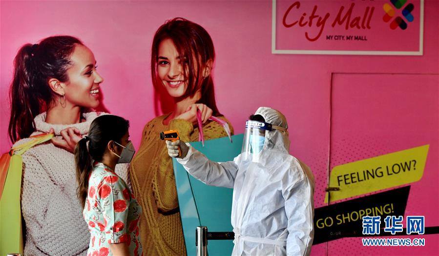​6月9日,在印度大诺伊达地区,进入商场的人接受体温检测。印度中央政府从8日开始正式允许餐馆、购物中心和宗教场所对民众开放,这也是印度分阶段放松管控的第一步。 新华社发(帕塔·萨卡尔摄)