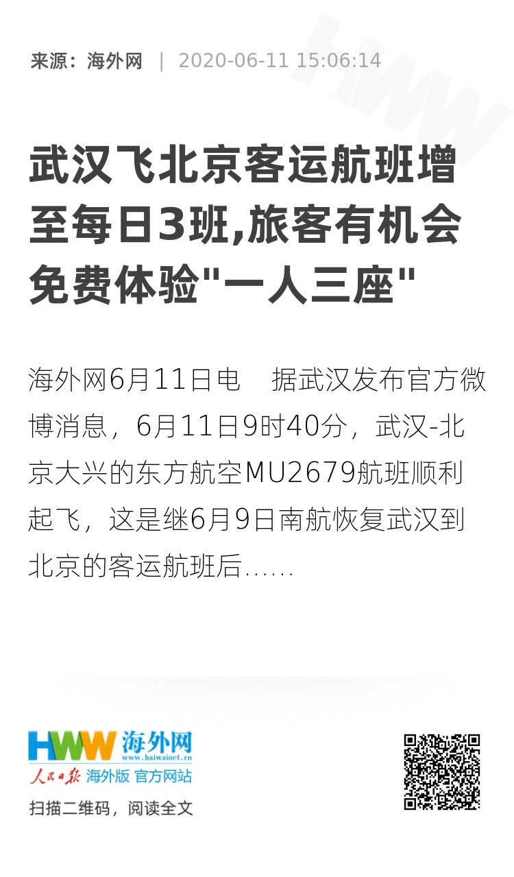 海外网6月11日电 据武汉发布官方微博消息,6月11日9时40分,武汉-北京大兴的东方航空MU2679航班顺利起飞,这是继6月9日南航恢复武汉到北京的客运航班后,又一家航空公司在武汉恢复北京客运航线。