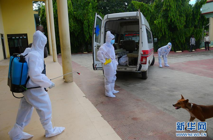 6月10日,医护人员在印度东北部特里普拉邦阿加尔塔拉的一处火葬场喷洒消毒剂。 新华社发