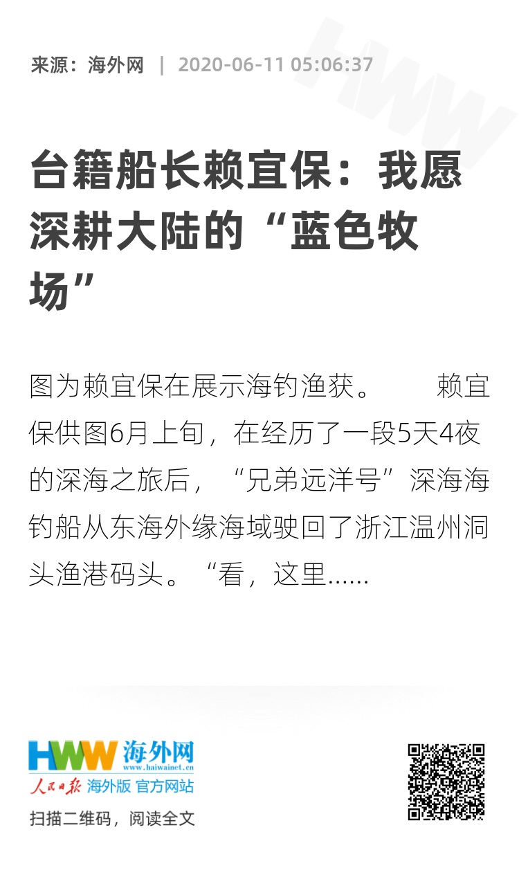“在深海海钓方面,中国大陆还有较大的发展潜力。这里市场大,海钓爱好者也多,如果能够好好发展这一产业,比如培养更多专业海钓人才、提升管理水平、配套硬件设施、普及海钓知识,我相信深海海钓会成为更多人乐于从事的一项休闲渔业活动。深耕大陆的‘蓝色牧场’,这是我的心愿。”赖宜保表示。