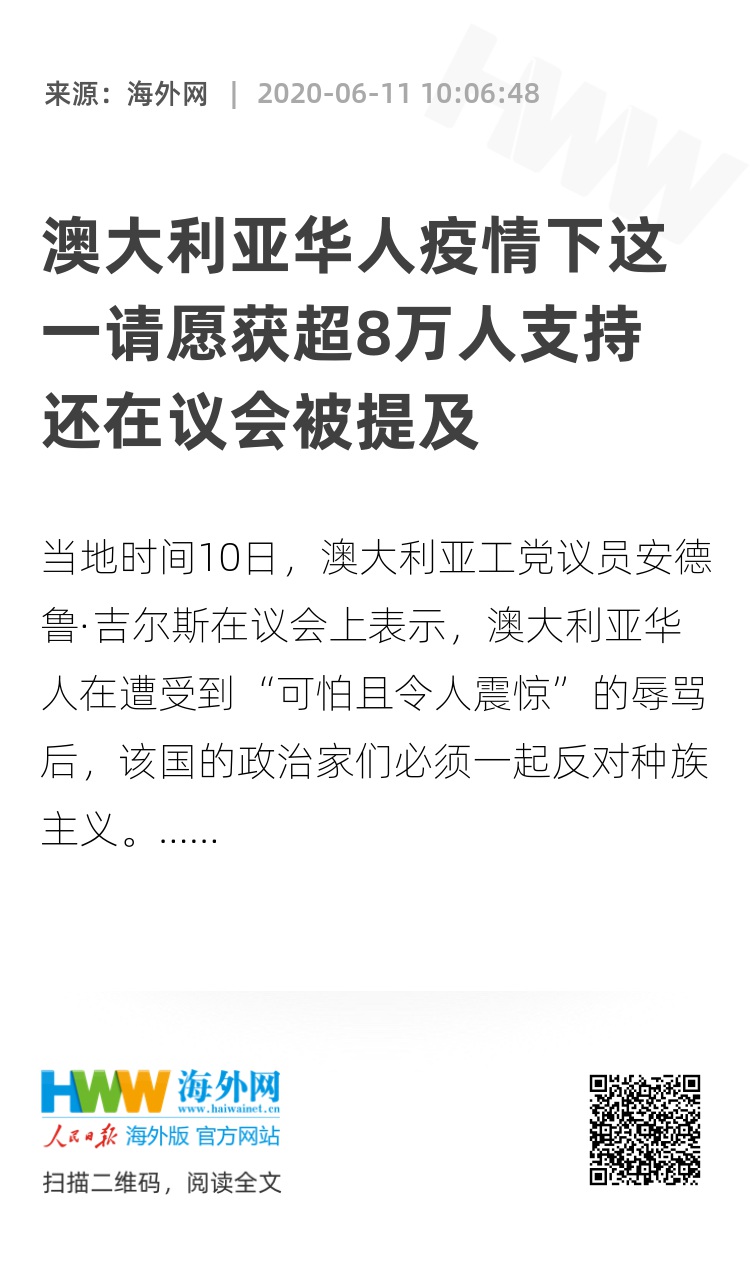 据悉,这一请愿书主要是支持十余名知名澳大利亚华人的一封公开信,他们表达了对近期针对亚裔澳大利亚人的、不断抬头的种族歧视和侮辱行为的极度担心。请愿标题是“谴责针对亚裔澳大利亚人的种族主义攻击,在疫情之下团结起来对抗恐惧”。请愿书中提到:“在这次新冠肺炎疫情流行期间,我们呼吁团结,对针对亚裔的种族主义说不。我们最近对亚裔澳大利亚人遭受的种族辱骂和污辱化现象深感不安”,内文提到,在澳大利亚的许多城市中,都可以看到亚裔澳大利亚人在大街上遭到暴力袭击,在公共交通工具上遭到辱骂、吐口水等等。城市和城镇的墙壁上也出现了丑陋的种族主义涂鸦。