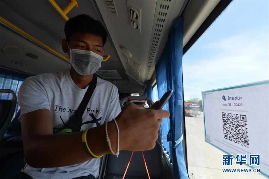 为控制疫情,泰国政府要求从6月11日起,全国所有乘坐巴士的民众每次乘车时必须扫码登录官方定位程序。 新华社发(拉亨摄)
