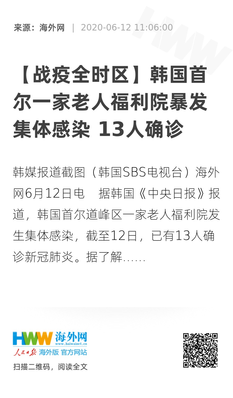 海外网6月12日电 据韩国《中央日报》报道,韩国首尔道峰区一家老人福利院发生集体感染,截至12日,已有13人确诊新冠肺炎。