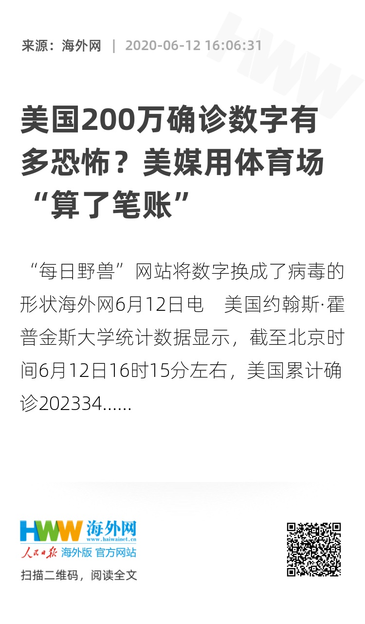 海外网6月12日电 美国约翰斯·霍普金斯大学统计数据显示,截至北京时间6月12日16时15分左右,美国累计确诊2023347例新冠肺炎病例,累计死亡病例113820例。美媒“每日野兽”表示,在美国累计确诊数字超过200万例之际,白宫疫情应对小组已经对疫情表示了担忧,但政府仍然选择将目光转向经济重启。