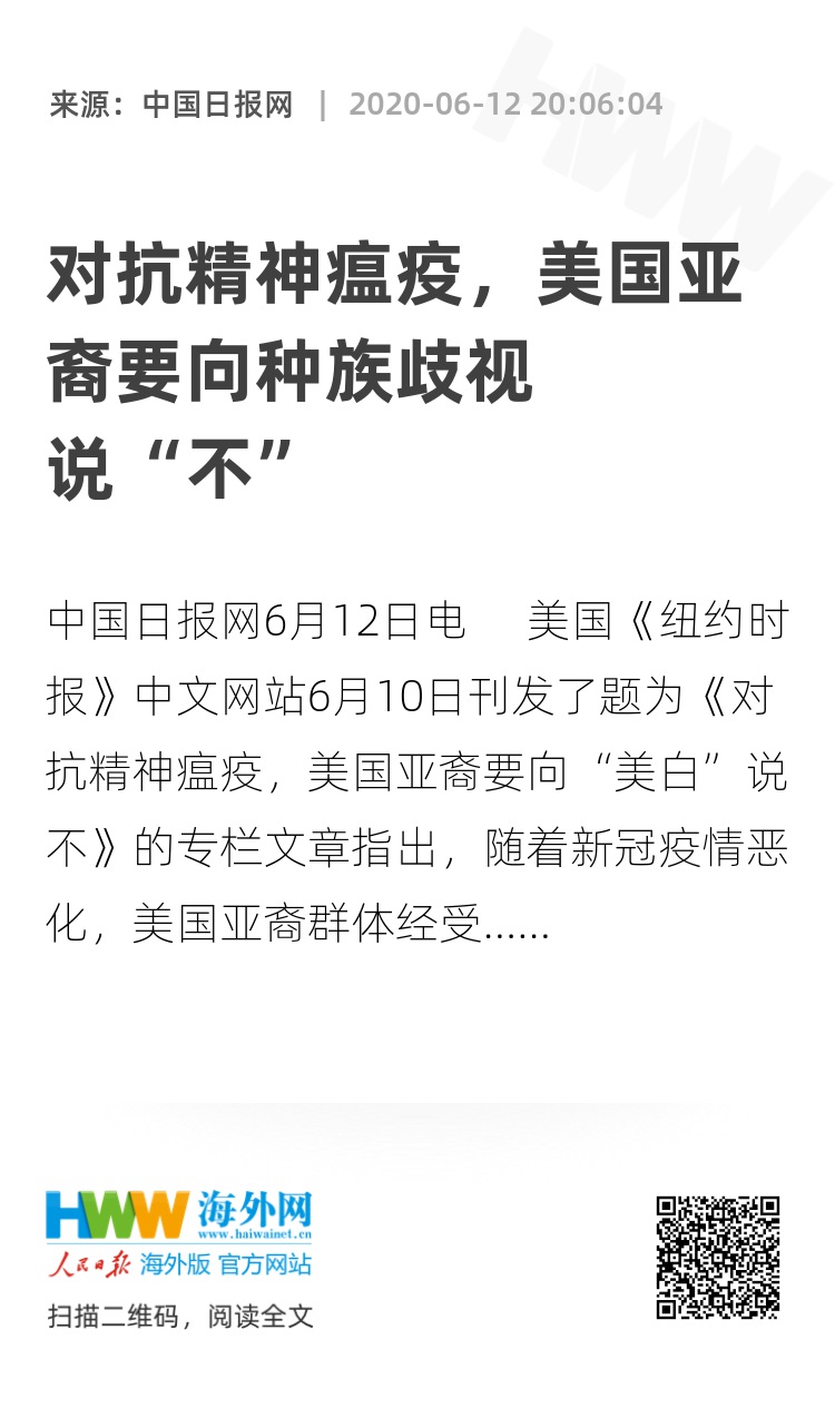 中国日报网6月12日电 美国《纽约时报》中文网站6月10日刊发了题为《对抗精神瘟疫,美国亚裔要向“美白”说不》的专栏文章指出,随着新冠疫情恶化,美国亚裔群体经受的伤害和冒犯不断加重,亚裔也要勇于对种族歧视这种“精神瘟疫”说不。