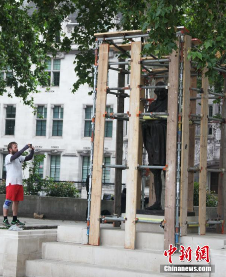 当地时间6月12日,伦敦一些历史人物塑像被支架和金属板包裹保护起来,以防在游行示威中被涂鸦和毁坏。图为当地正在对印度国父圣雄甘地塑像进行的“包裹”保护工程。 中新社记者 张平 摄