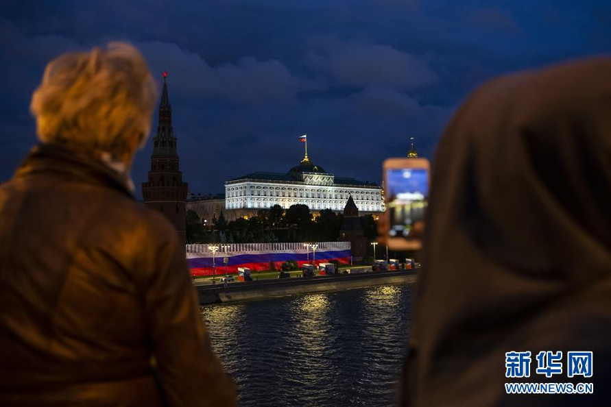 6月12日,人们在俄罗斯首都莫斯科观看克里姆林宫红墙外的灯光秀。新华社发(亚历山大摄)