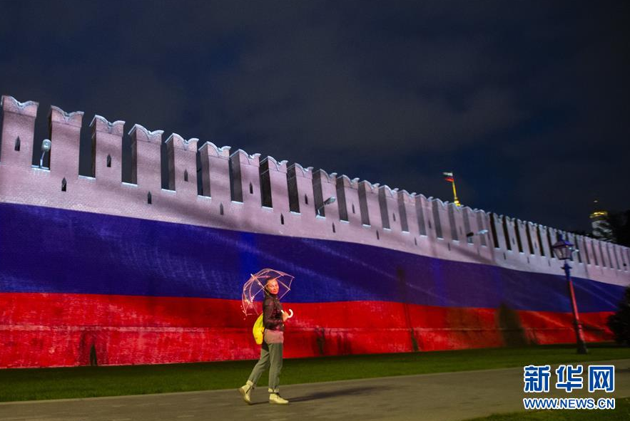6月12日,一名女子从俄罗斯首都莫斯科的克里姆林宫红墙前走过。新华社发(亚历山大摄)