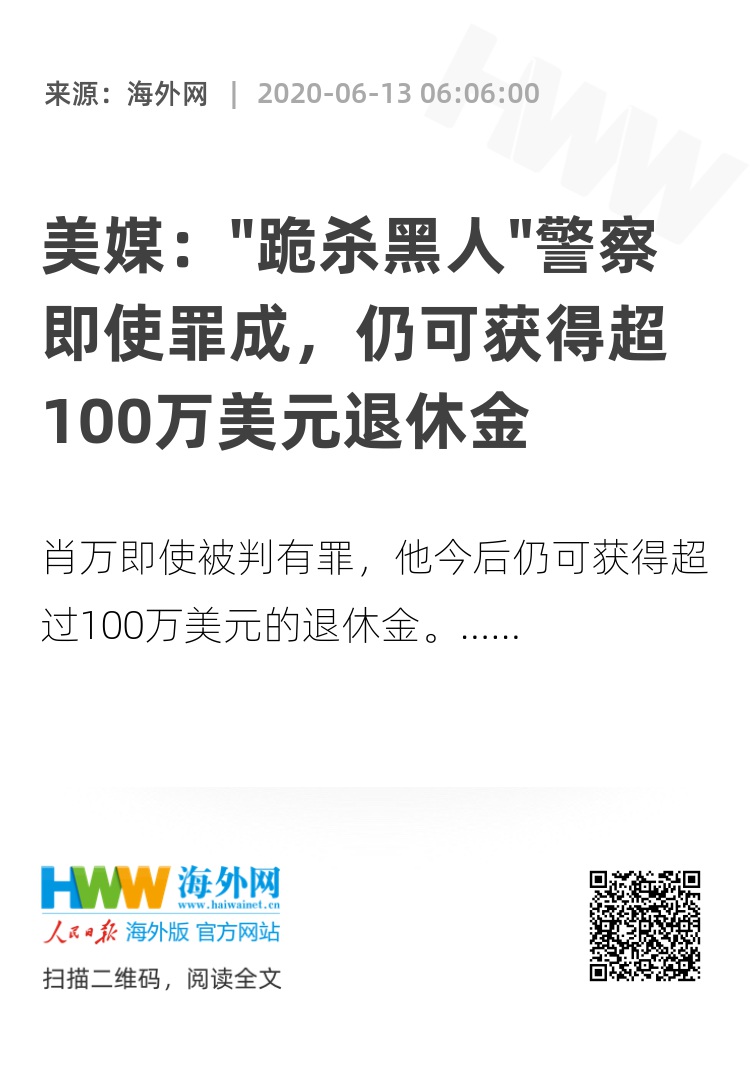 海外网6月13日电 据美国有线电视新闻网(CNN)6月12日报道,涉嫌暴力执法致非洲裔男子乔治·弗洛伊德死亡的美国前警察德雷克·肖万,即使被判有罪,他今后仍可获得超过100万美元的退休金。目前,肖万被指控二级谋杀和二级故意杀人罪。