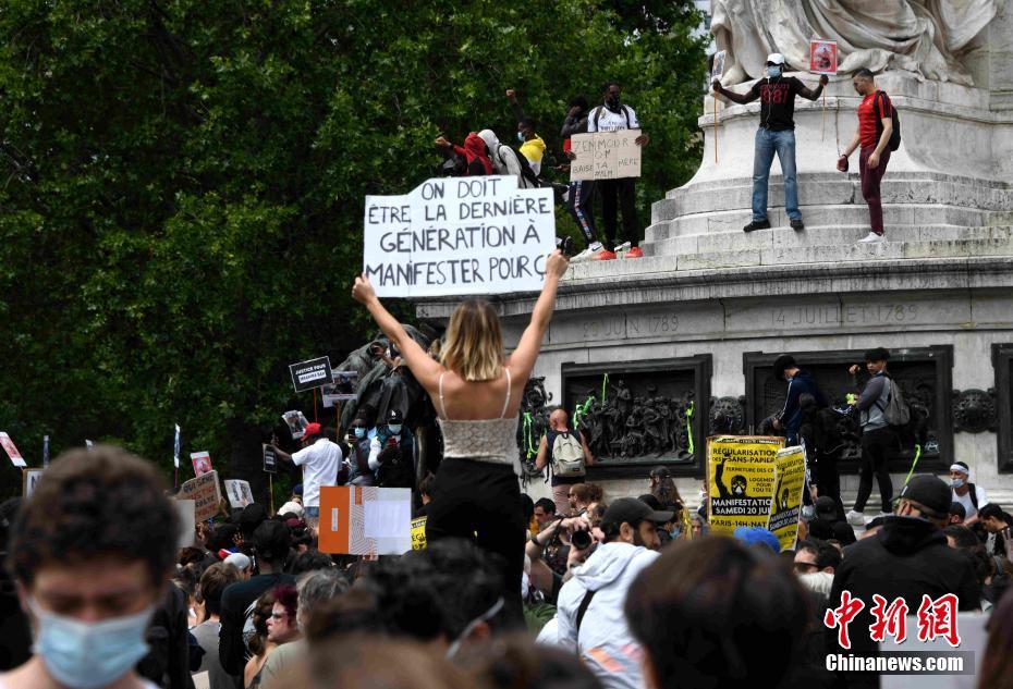 当地时间6月13日,法国首都巴黎万余人继续示威抗议种族歧视。有年轻示威者手持标语牌上面写着,希望能够成为抗议种族歧视的“最后一代人”。由于当天示威人群密集,使得新冠肺炎疫情防控面临巨大挑战。 中新社记者 李洋 摄