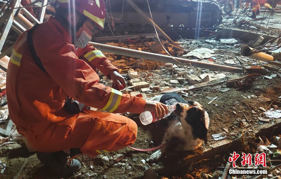 6月13日,一名消防队员在给受伤的搜救犬喂水。中新社发 孙佳琦 摄