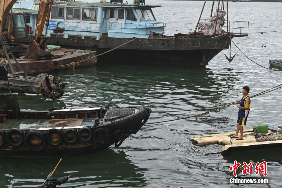 6月14日,在位于广东省阳江市的闸坡国家中心渔港内,工作人员对渔船进行锚缆加固。今年首个登陆中国的台风“鹦鹉”于6月14日8点50分以热带风暴级(9级,23米/秒)在阳江海陵岛登陆。 中新社记者 陈骥旻 摄
