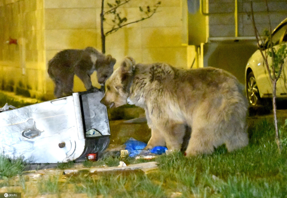 当地时间2020年6月13日,土耳其卡尔斯省萨勒卡默什,棕熊妈妈带着幼崽在垃圾箱翻找,寻觅食物。来源:IC photo