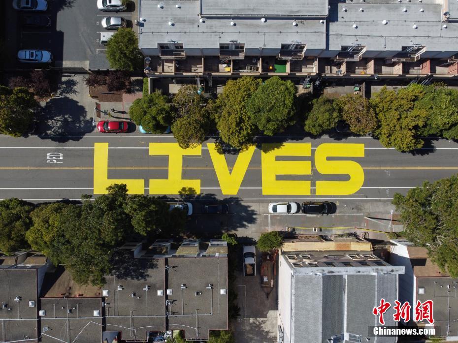 当地时间6月13日,美国旧金山市政厅附近的街面上,出现用黄油漆涂写的巨幅“Black Lives Matter”(黑人的命也是命)字样。由美国明尼苏达州白人警察暴力执法致非洲裔男子乔治·弗洛伊德死亡一事在美国引发的全国性示威活动已持续多日,相关壁画、字样也出现在美国多地。 中新社记者 刘关关 摄