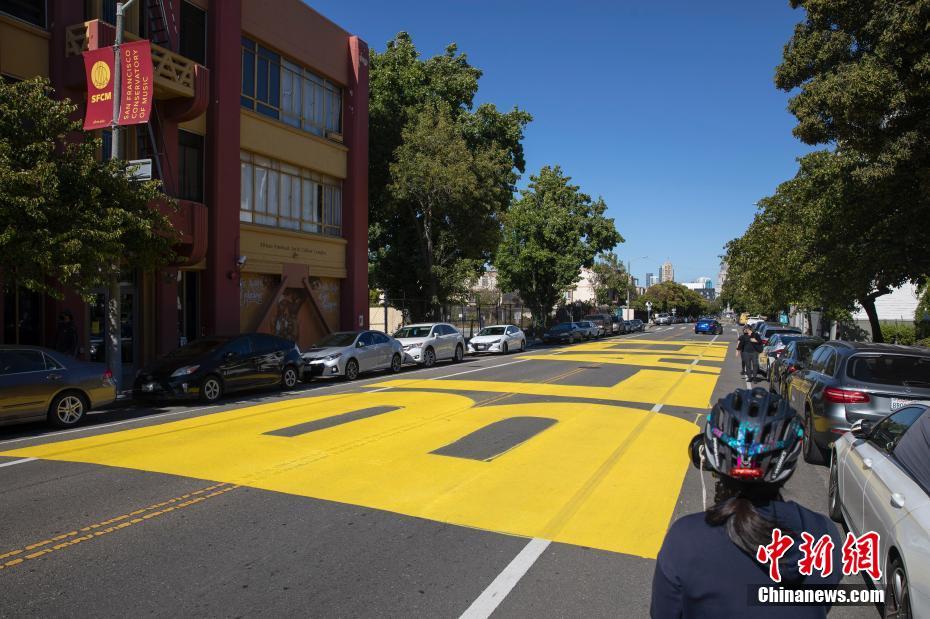 当地时间6月13日,美国旧金山市政厅附近的街面上,出现用黄油漆涂写的巨幅“Black Lives Matter”(黑人的命也是命)字样。由美国明尼苏达州白人警察暴力执法致非洲裔男子乔治·弗洛伊德死亡一事在美国引发的全国性示威活动已持续多日,相关壁画、字样也出现在美国多地。 中新社记者 刘关关 摄