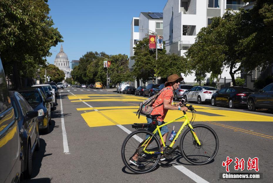 当地时间6月13日,美国旧金山市政厅附近的街面上,出现用黄油漆涂写的巨幅“Black Lives Matter”(黑人的命也是命)字样。由美国明尼苏达州白人警察暴力执法致非洲裔男子乔治·弗洛伊德死亡一事在美国引发的全国性示威活动已持续多日,相关壁画、字样也出现在美国多地。 中新社记者 刘关关 摄