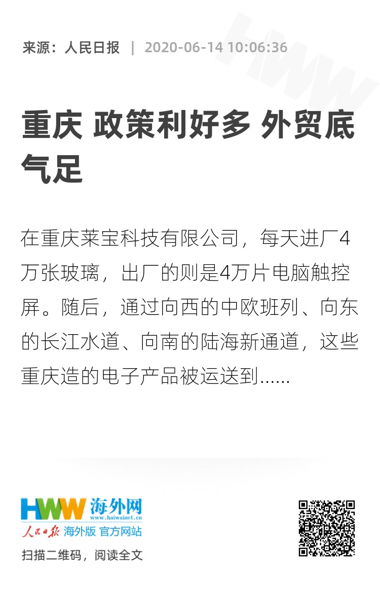 在重庆莱宝科技有限公司,每天进厂4万张玻璃,出厂的则是4万片电脑触控屏。随后,通过向西的中欧班列、向东的长江水道、向南的陆海新通道,这些重庆造的电子产品被运送到世界各地。