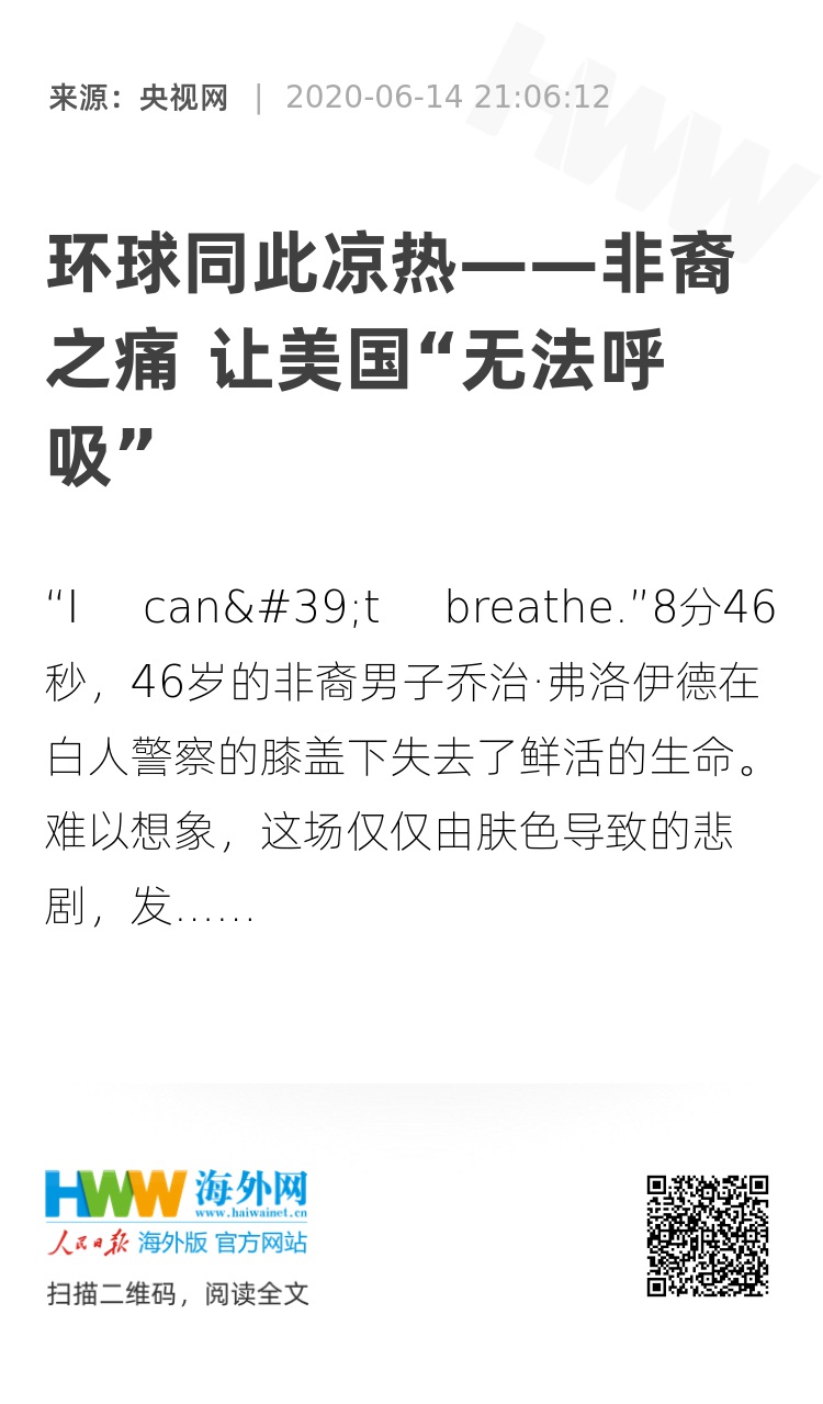 “I can't breathe.”8分46秒,46岁的非裔男子乔治·弗洛伊德在白人警察的膝盖下失去了鲜活的生命。难以想象,这场仅仅由肤色导致的悲剧,发生在21世纪的今天,发生在四处宣扬“自由平等”的美国。