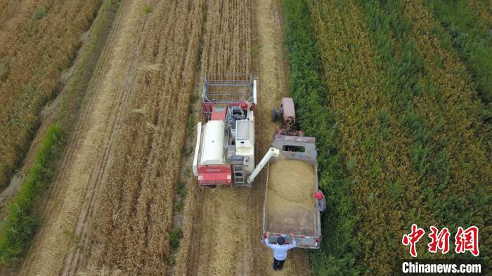 14日,新疆轮台县阿克萨来乡阿克萨来村二组农民在收割冬小麦。 确·胡热 摄