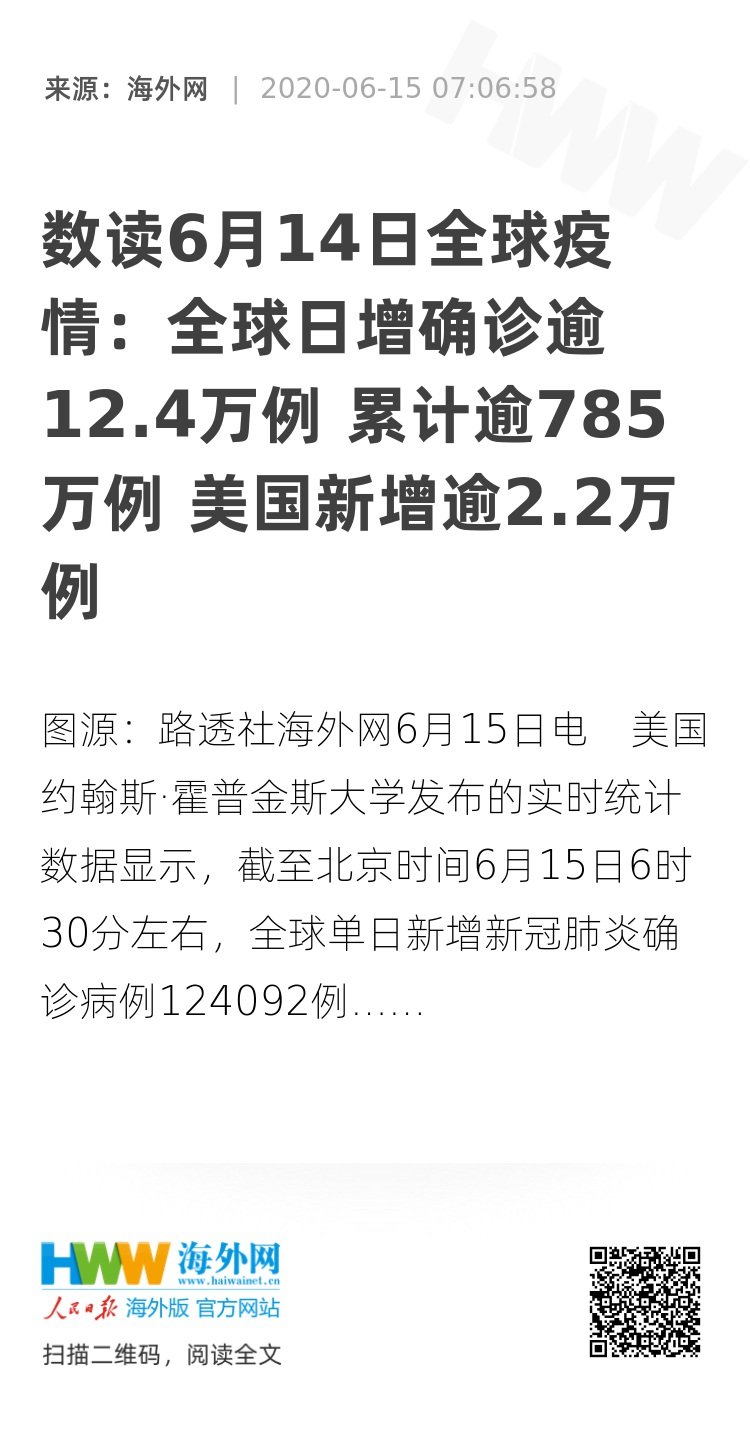 海外网6月15日电 美国约翰斯·霍普金斯大学发布的实时统计数据显示,截至北京时间6月15日6时30分左右,全球单日新增新冠肺炎确诊病例124092例,累计确诊新冠肺炎病例7854514例,单日新增死亡病例3317例,累计死亡431418例。与前一日相比,中国以外新增确诊逾12.4万例,累计确诊逾776.9万例;中国以外新增死亡病例逾3317例,累计死亡病例逾42.6万例。