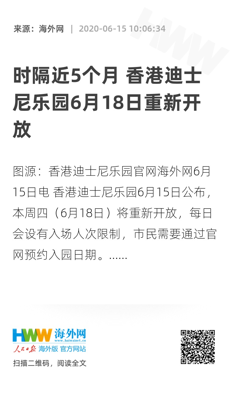 海外网6月15日电 香港迪士尼乐园6月15日公布,本周四(6月18日)将重新开放,每日会设有入场人次限制,市民需要通过官网预约入园日期。