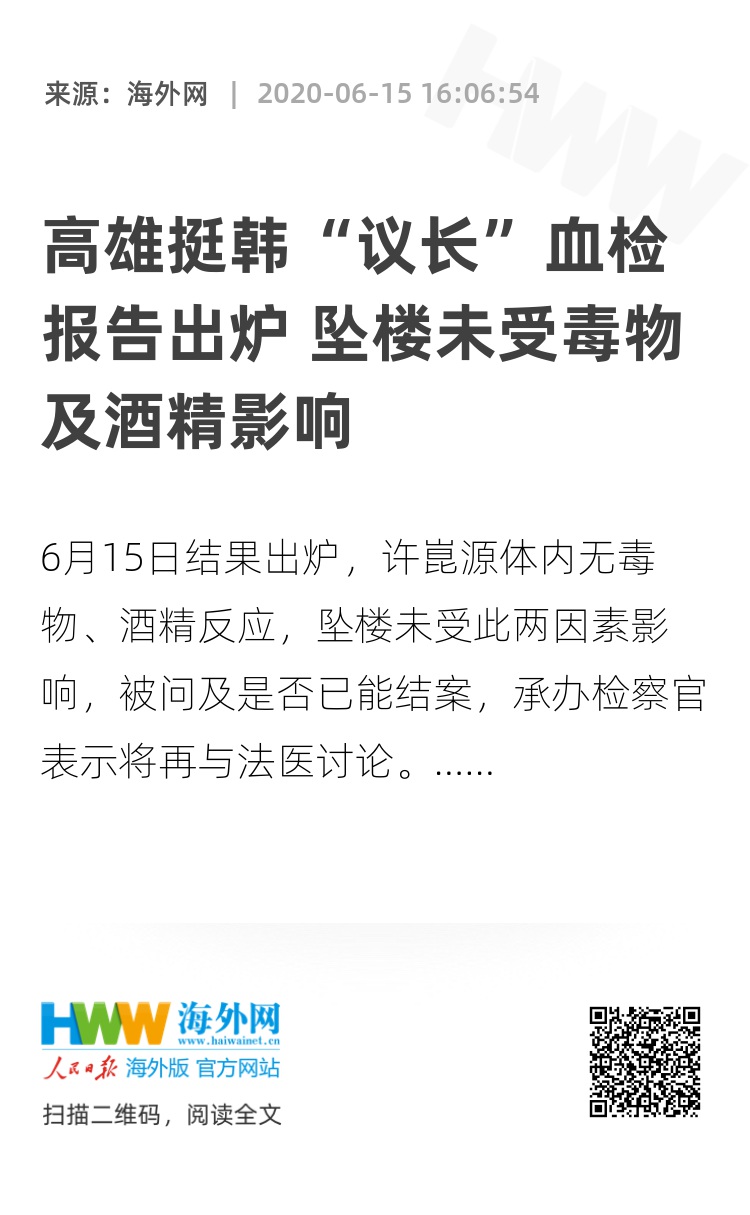 海外网6月15日电 高雄市挺韩“议长”许崑源在6月6日晚间罢韩案结果出炉不久,从17楼住处坠楼身亡,检警连夜完成相验,初步排除“外部人为因素”,为求谨慎抽取血液化验。6月15日结果出炉,许崑源体内无毒物、酒精反应,坠楼未受此两因素影响,被问及是否已能结案,承办检察官表示将再与法医讨论。