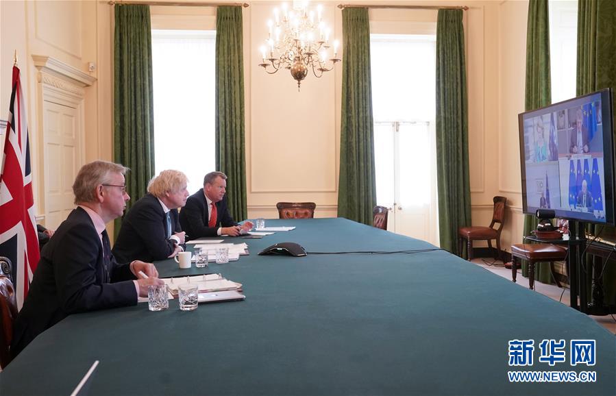 6月15日,英国首相约翰逊(左二)在英国伦敦首相府与欧洲理事会主席米歇尔、欧盟委员会主席冯德莱恩、欧洲议会议长萨索利举行视频会谈。 英国与欧盟15日确认,英国“脱欧”过渡期将于今年年底结束且不再延长,双方同意加快未来关系谈判,希望在年内达成一份贸易协议。 新华社发(英国首相府供图)