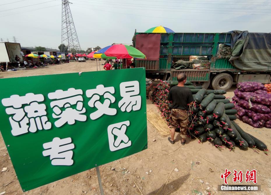 6月16日,北京新发地批发市场休市后,设在京良路北侧一处临时交易周转场内,部分蔬菜、水果商户在此进行交易。图为新发地批发市场临时交易区。 中新社记者 张宇 摄