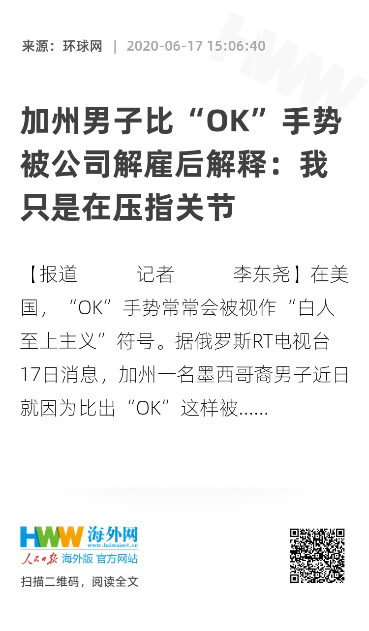 【环球网报道 记者 李东尧】在美国,“OK”手势常常会被视作“白人至上主义”符号。据俄罗斯RT电视台17日消息,加州一名墨西哥裔男子近日就因为比出“OK”这样被认为宣传“白人至上”的手势被公司解雇。不过,这名男子自称当时只是在压指关节,这也引发一些要求恢复其工作的呼声。